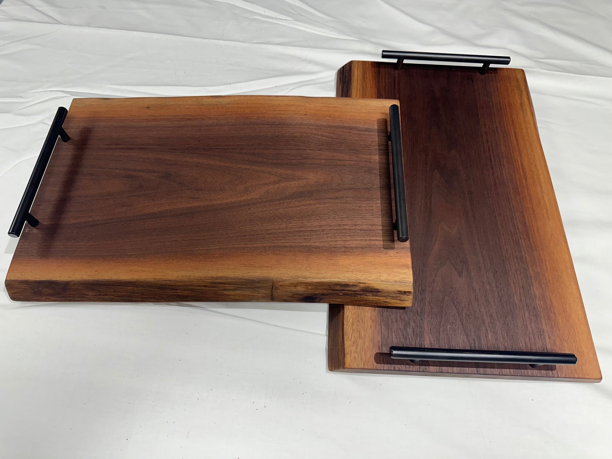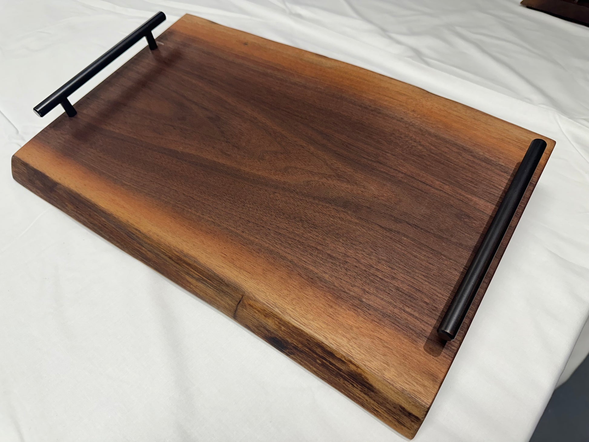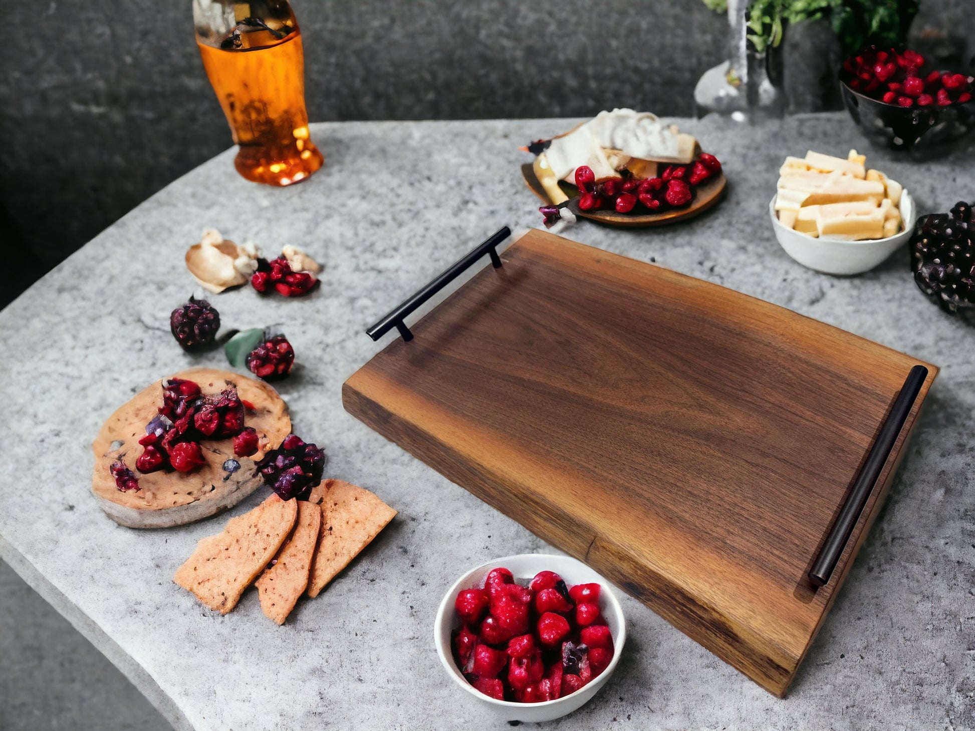 This gorgeous black walnut serving tray makes a perfect charcuterie board, and comes fully functional with "oil-rubbed bronze" handles and no-slip feet on the base.