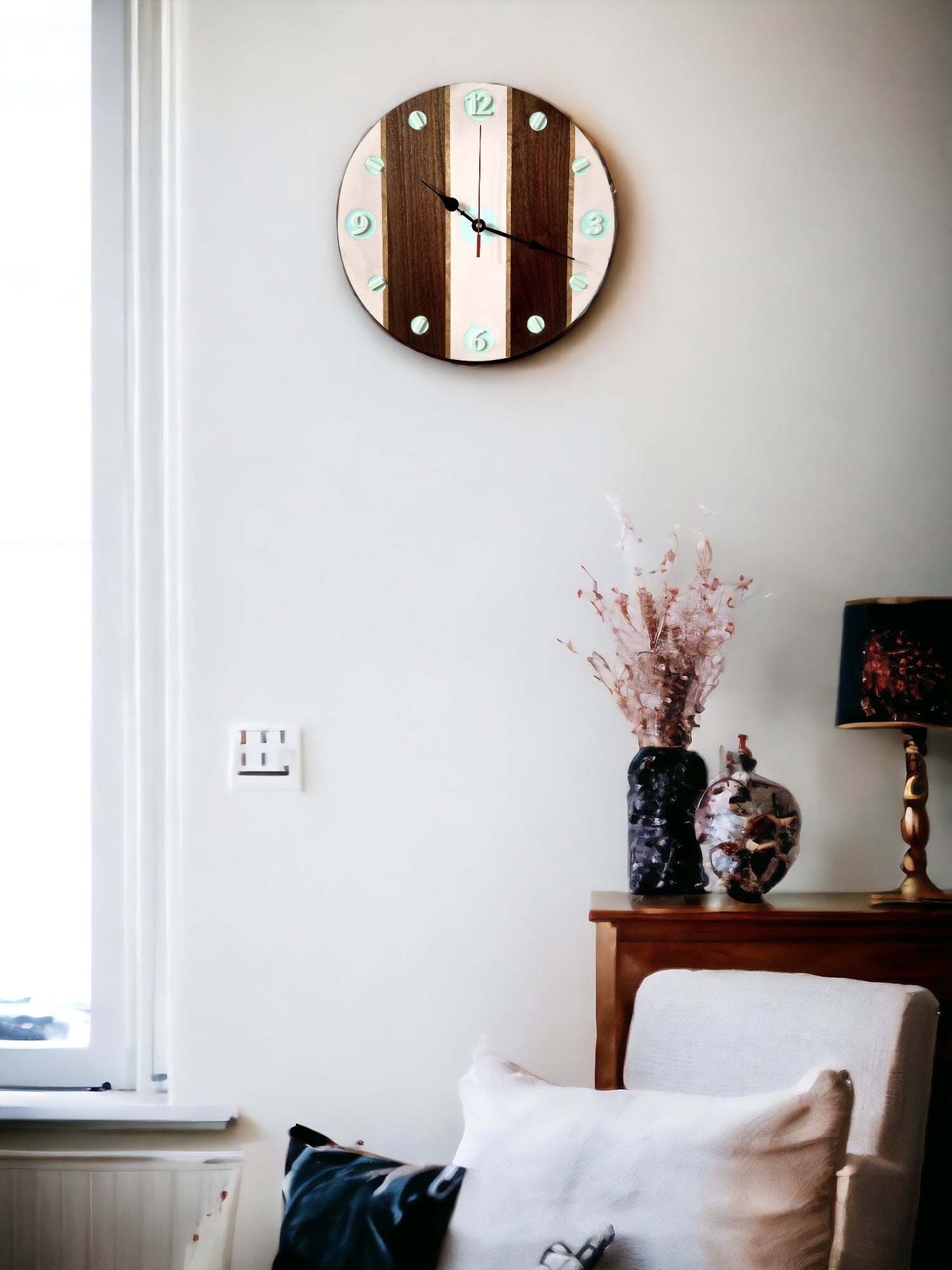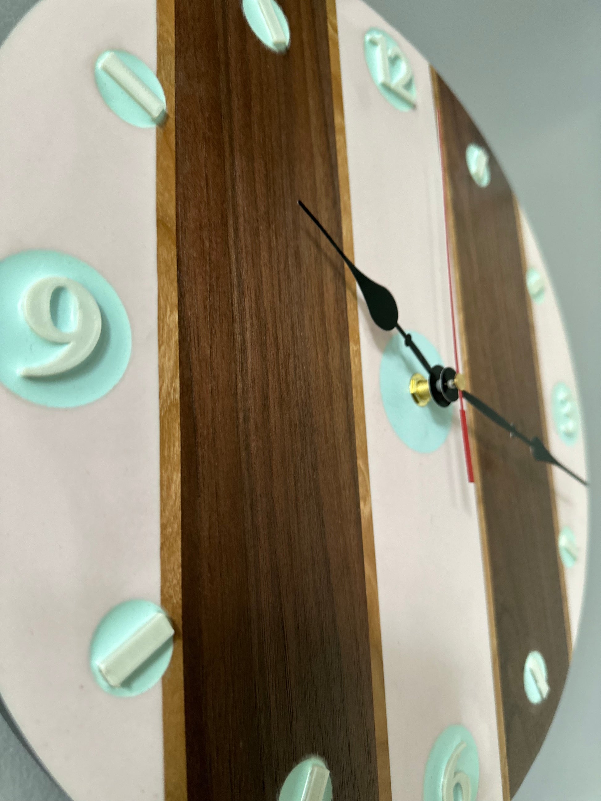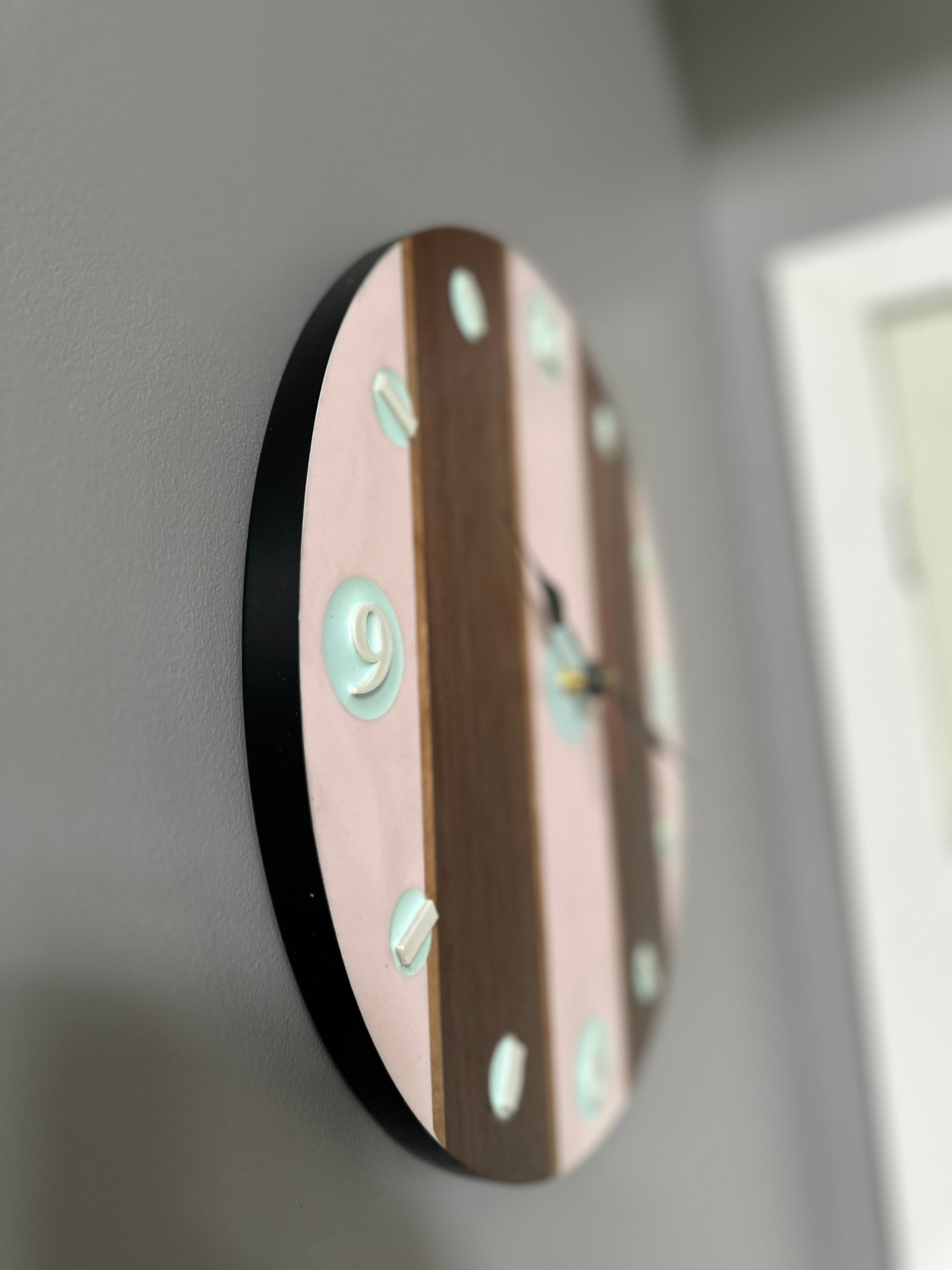 This beautiful one-of-a-kind 14" wall clock features two types of hardwood along with white, baby blue & pink accents. The elegant black hands create a classy feel, making this the perfect addition to just about any living space.