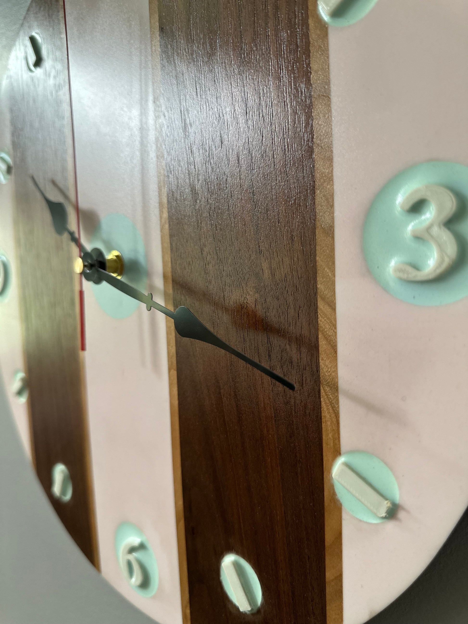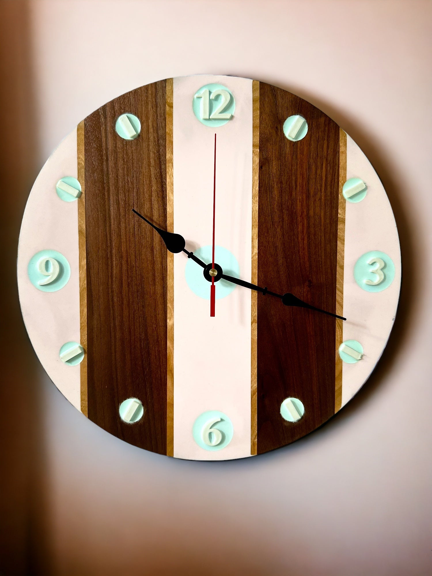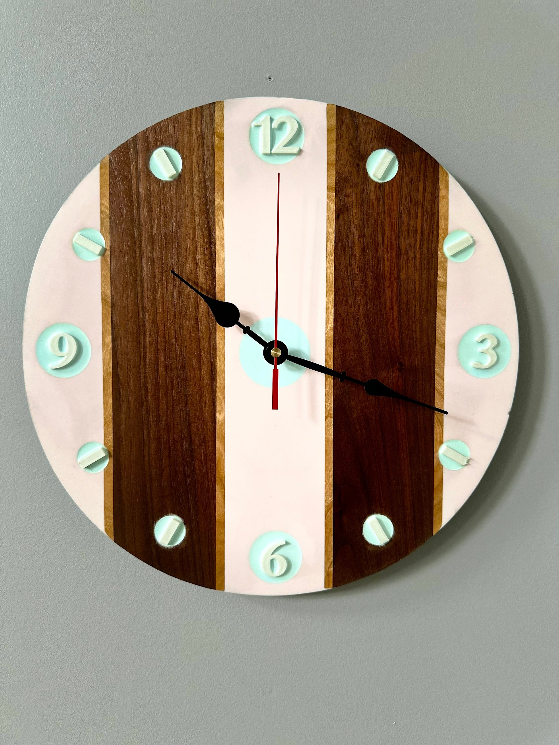 This beautiful one-of-a-kind 14" wall clock features two types of hardwood along with white, baby blue & pink accents. The elegant black hands create a classy feel, making this the perfect addition to just about any living space.