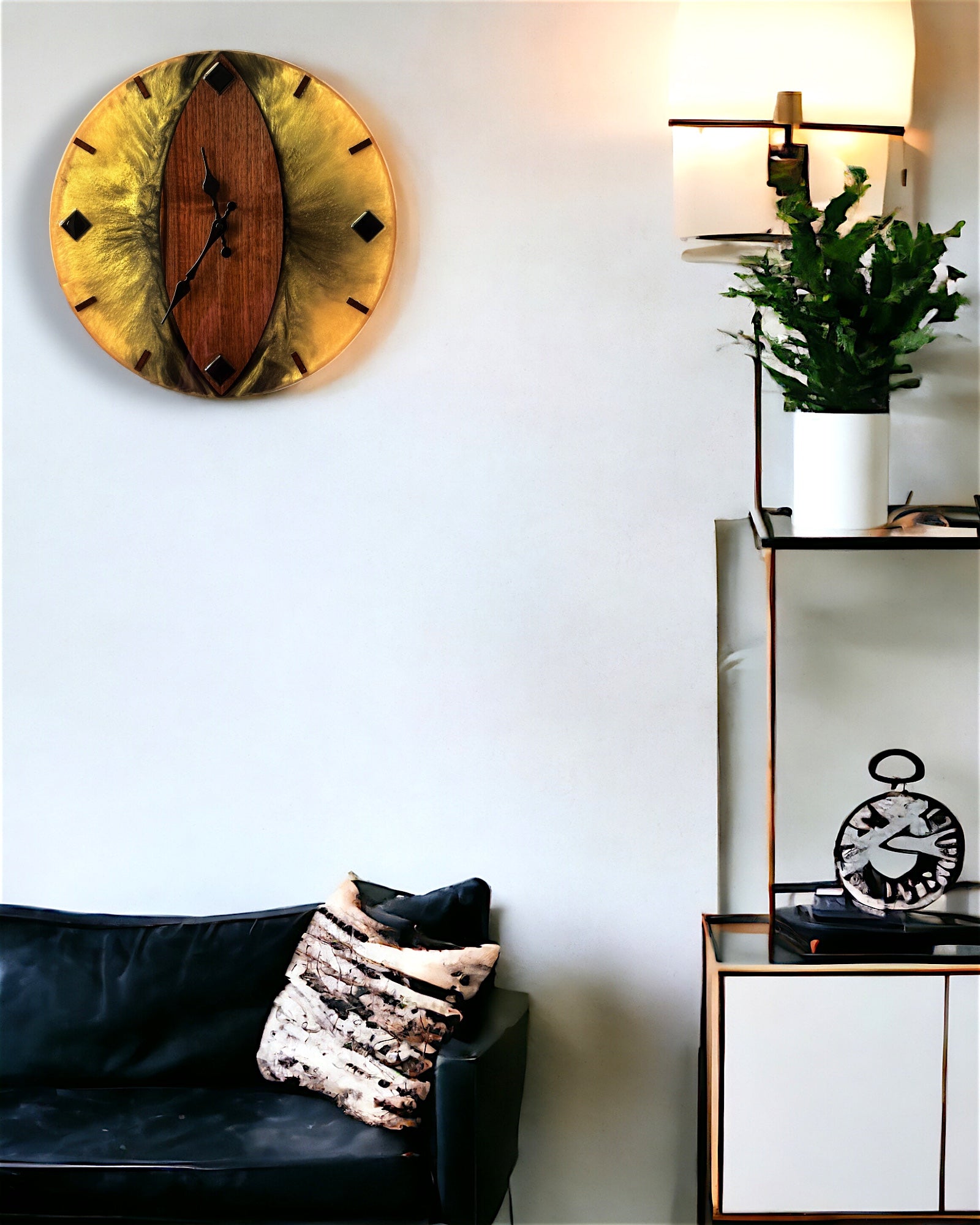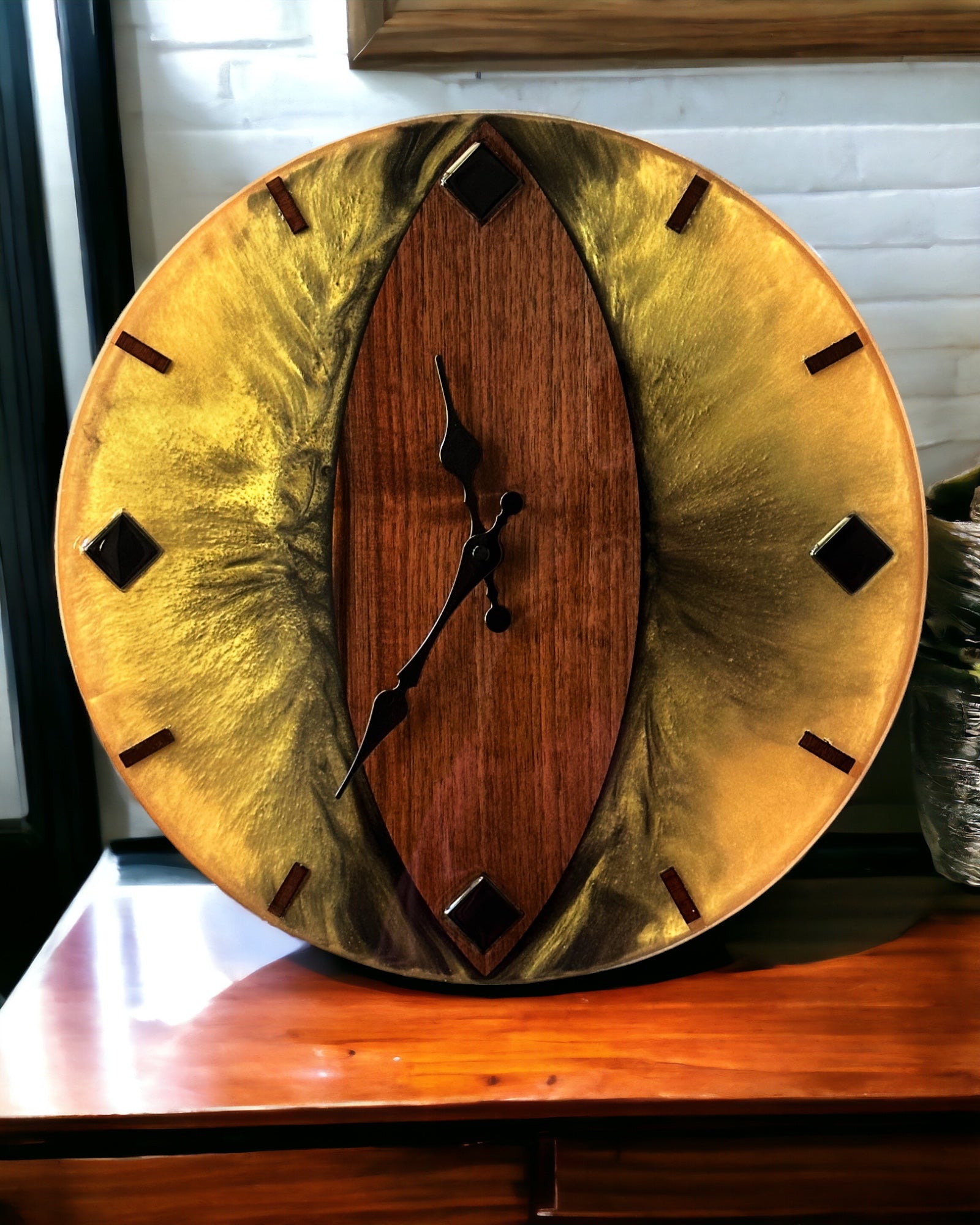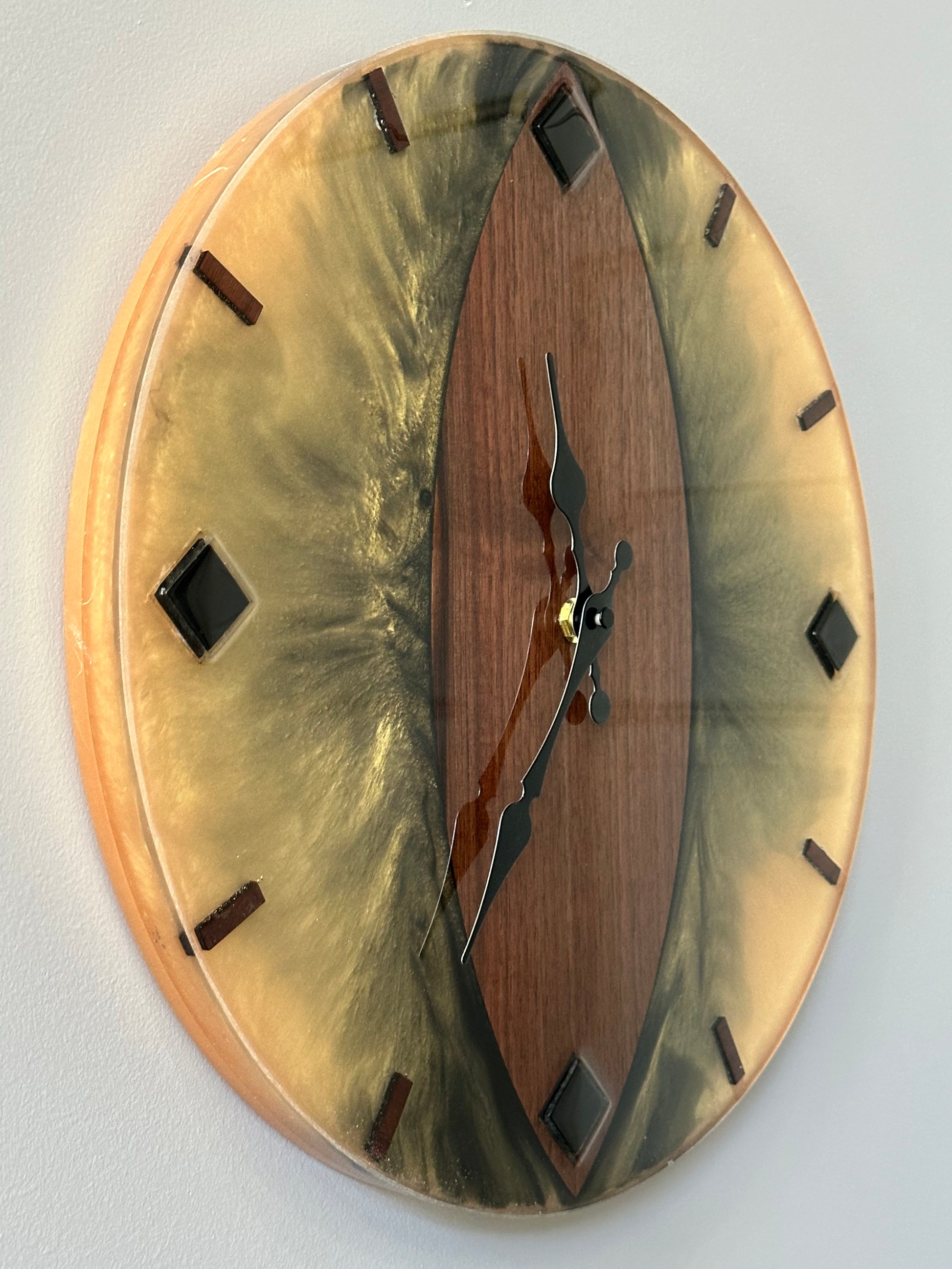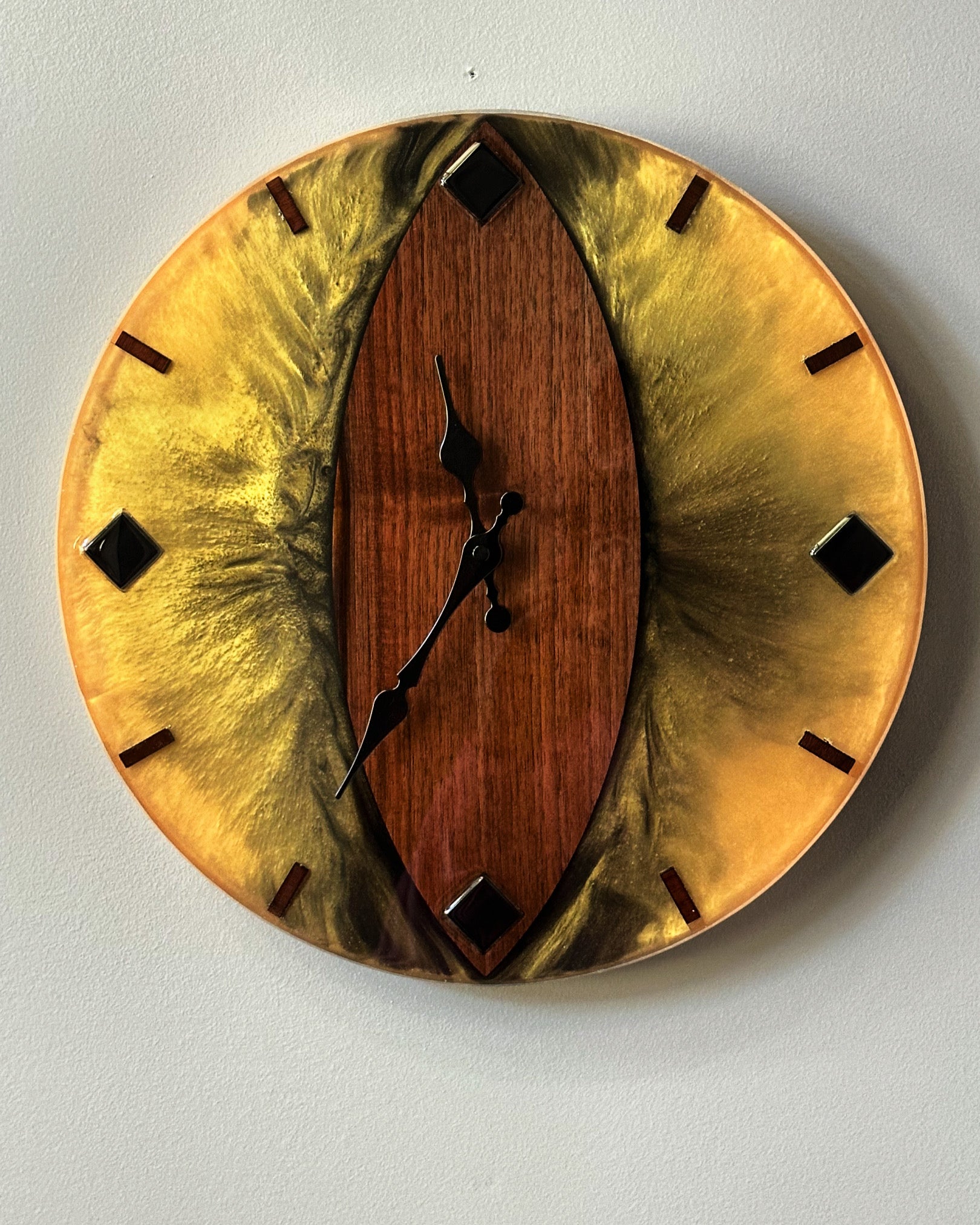 Inspired by the eye of a dragon, this rare 14" wall clock features a black walnut center surrounded by a firey blend of glossy deep black and orange swirls. Black glass tiles adorn the four main hour positions, with black walnut accents for the remaining positions.