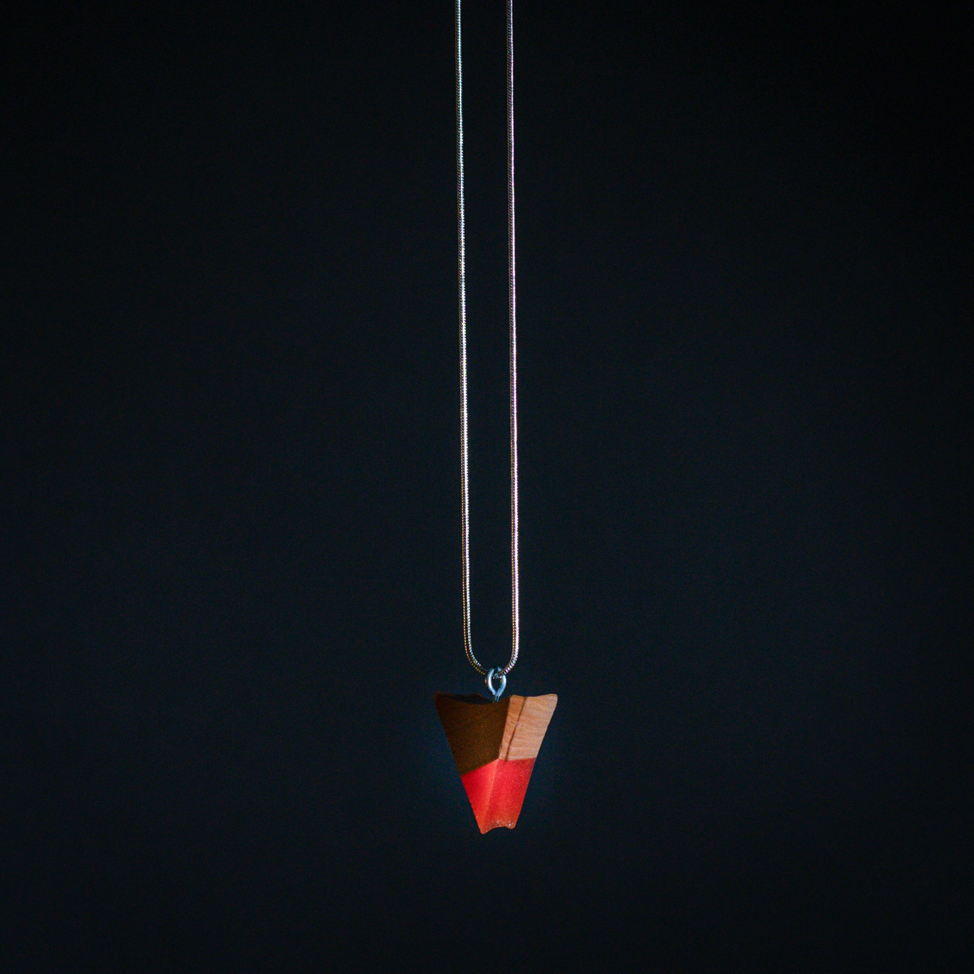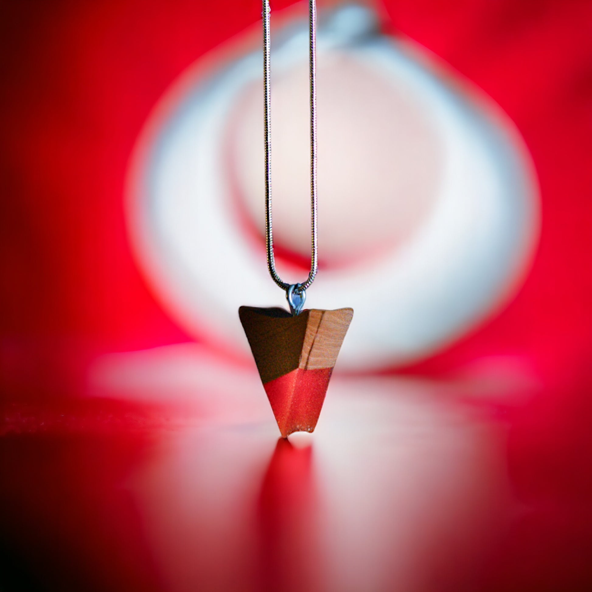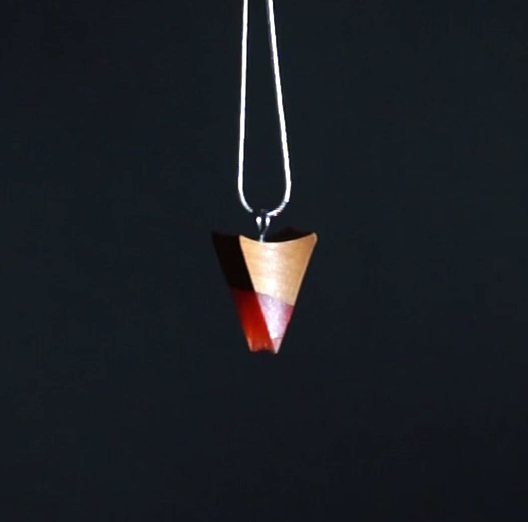 Measuring approximately 1" tall, this unique shape features a combination of black walnut and maple, along with semi-transparent magenta resin.